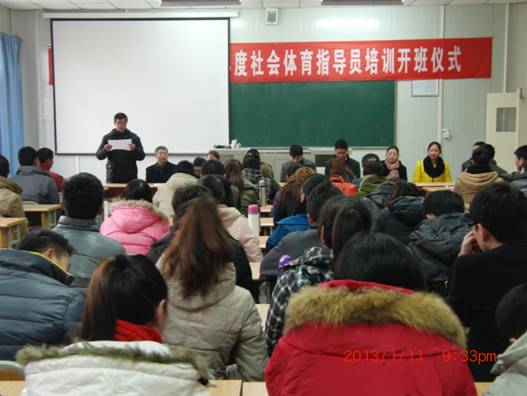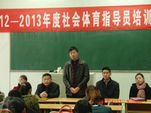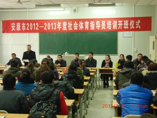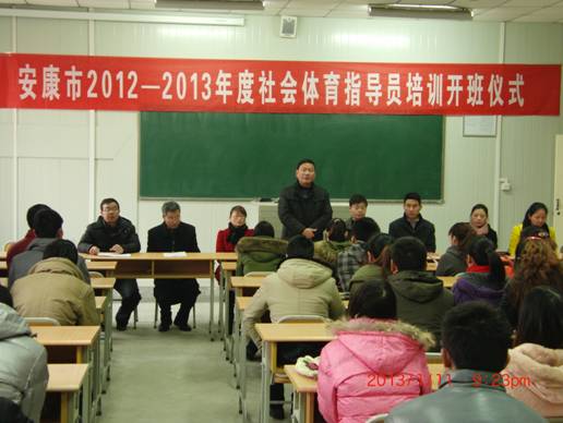 2013年1月12日上午9:00,安康市2012-2013年度社会体育指导员培训班开班典礼在公司举行。安康市体育局党组成员、纪检组长陈复勇、安康团市委副书记梁鸿、安康市体育局群体科科长朱小燕、英国正版365官网体育系主任冯德学、英国正版365官网体育系副主任鲁宗成等领导以及部分授课教师和全体学员共一百余人参加了开班典礼,典礼仪式由英国正版365官网体育系党总支书记沈军主持。