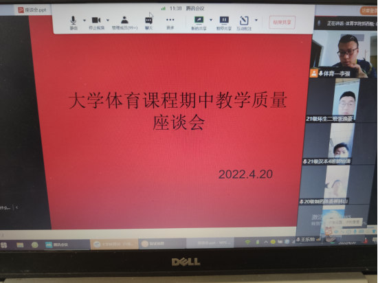 为了切实做好《大学体育》课程的教学工作,了解教学现状,科学安排教学内容,提高教学质量,促进大学体育课程改革,4月20日下午,大学体育教研室组织召开了2021—2022学年第二学期大学体育期中教学质量检查员工座谈会。校级教学督导冯德学、英国365集团教学督导鲁宗成、英国365集团副经理郭西魁、大学体育教研室主任李强以及各二级公司体育部干部、2020级和2021级各班班长、体育委员共172名同学参加了座谈会。为落实疫情防控措施,本次座谈会使用会议腾讯会议平台以线上形式召开,会议由李强主持。