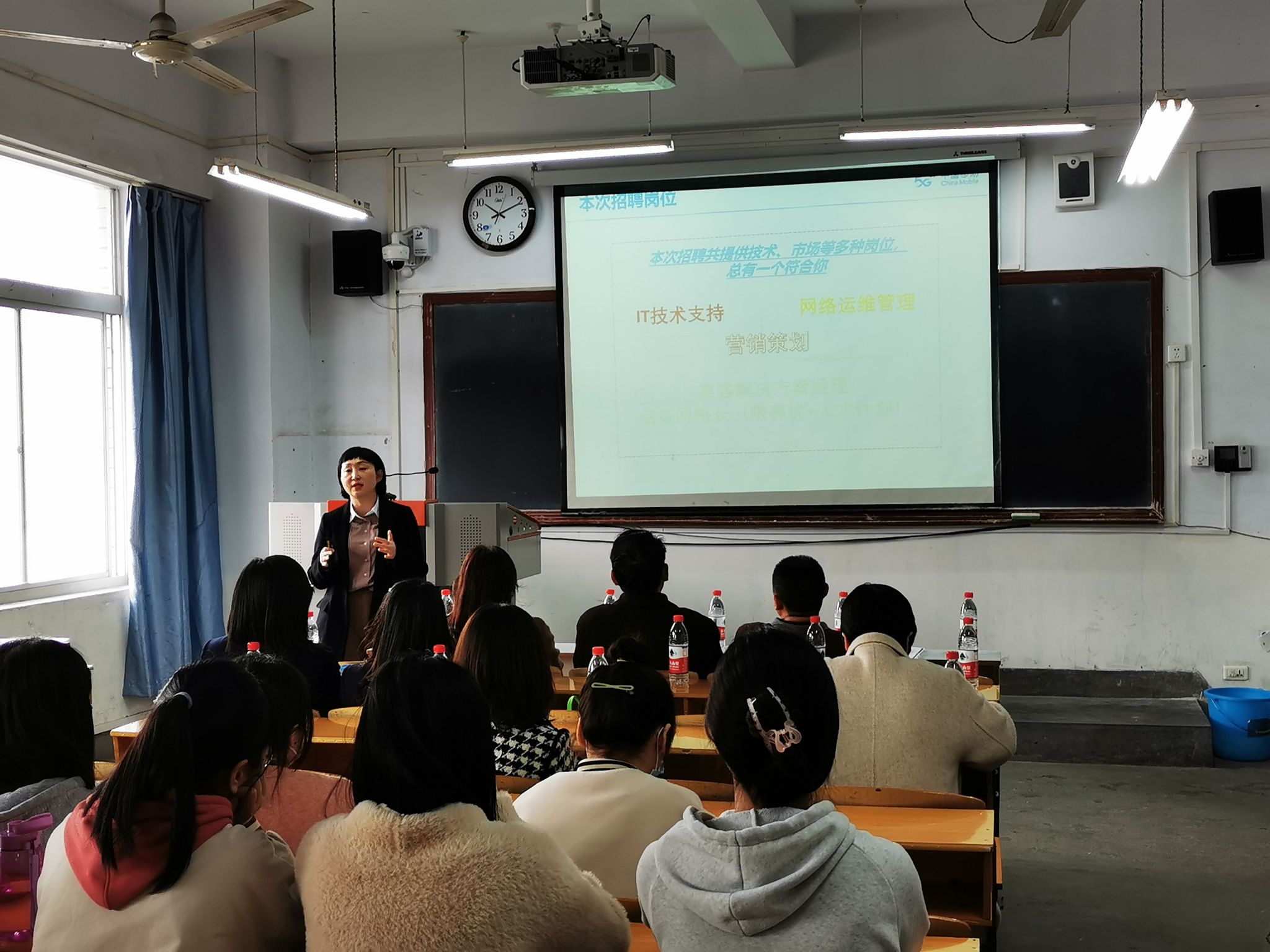 为了贯彻落实党中央国务院关于做好毕业生就业工作的要求,进一步拓宽毕业生就业渠道,促进公司2023届毕业生就业工作,3月17日早上9:30在1516教室,在公司招就处的指导下,公司和数统公司联合举办23届毕业生就业专场招聘会。招就处副处长程国栋、数统公司党总支书记郭全寿、公司党总支书记高立平、领军教育安康负责人冯云、领军懂得体育大市场负责人贾妮、安康移动人力资源部经理姜琼、安康移动招聘主管陈静及公司19级毕业生、20级在校生、数统公司员工参加。活动由康梦瑶主持。