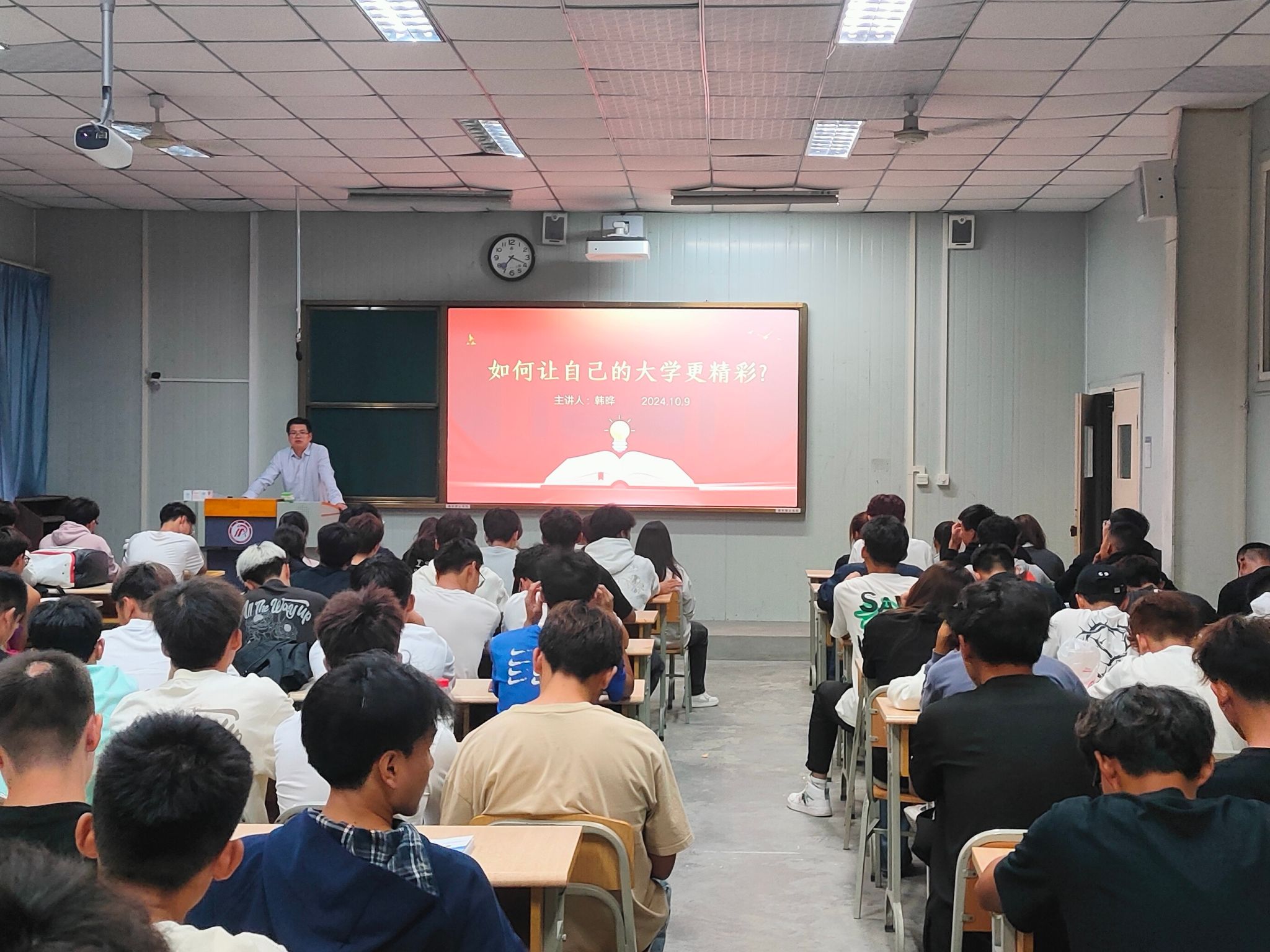 2024年10月9日晚上,公司党总支书记韩晔在10号教学楼1038教室为2024级体院新生带来入学教育课——如何让自己的大学更精彩。韩书记从“认识大学、学会学习、遵守纪律、做好发展”四个方面勾勒出精彩大学四年应有画像雏形,为24级全体新生带来大学启蒙教育,帮助他们正确认识大学,认识自我,了解未来发展趋势,坚定专业自信。