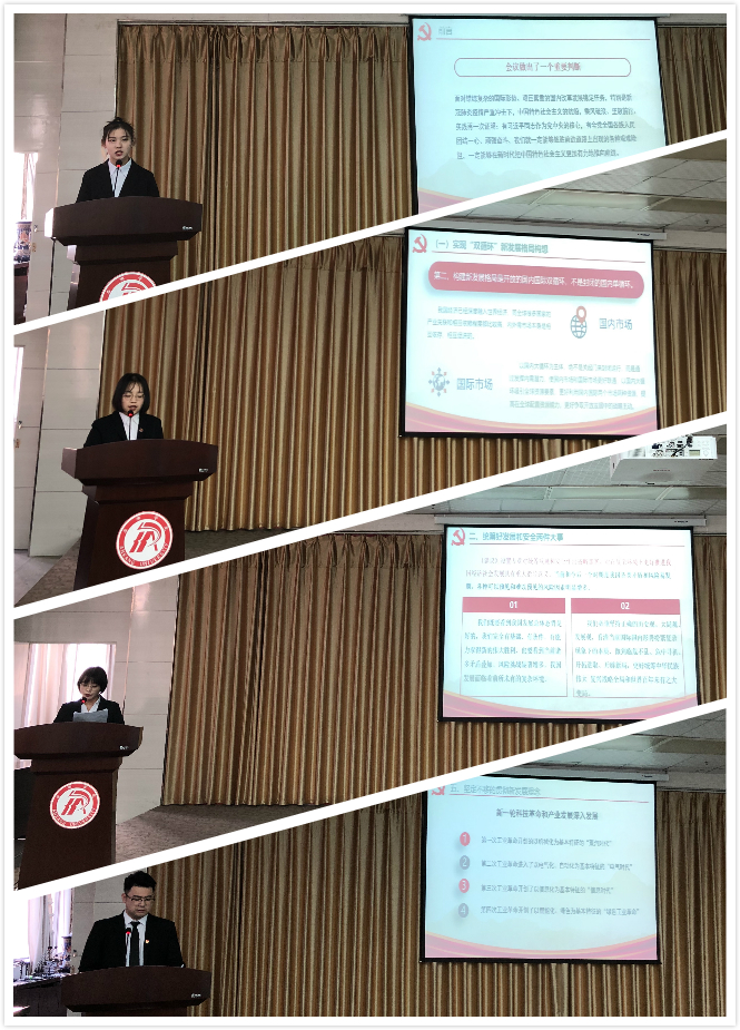 老员工宣讲团四位成员肖翔鸽、韩萌、梁苗苗、杨垚奀同学分别从深刻认识我国进入发展阶段的重大意义、有利条件和重要特征;统筹好发展和安全两件大事;准确把握“十四五”时期我国发展的主导方针、主要目标和2035年远景目标;牢牢把握构建新发展格局的战略构想和重要着力点;坚定不移的贯彻新理念几个方面对党的十九届五中全会精神进行了讲解。